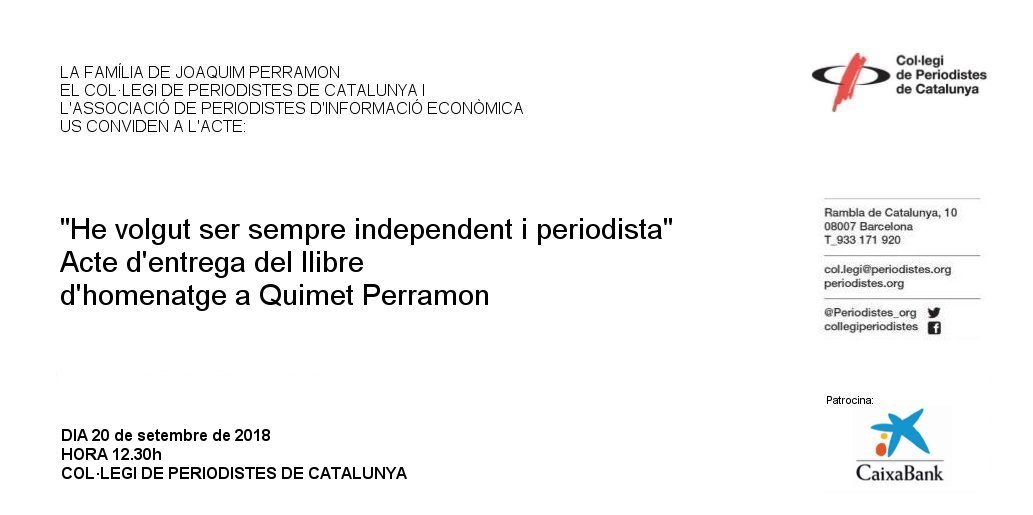 El Col·legi de Periodistes, la família de Joaquim Perramon i l'Associació de Periodistes d'Informació Econòmica (APIE) organitzen un acte d'entrega del llibre homenatge a Quimet Perramon el pròxim dijous 20 de setembre a les 12:30h a la demarcació de Barcelona del Col·legi. La publicació recopila les intervencions de l’acte que es va celebrar ara fa un any amb motiu del 10è aniversari de la seva pèrdua.