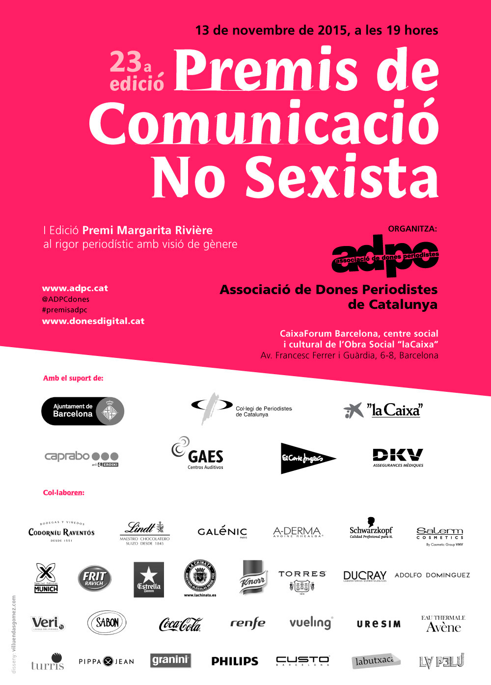 L'Associació de Dones Periodistes de Catalunya (ADPC) celebrarà el divendres 13 de novembre el lliurament dels Premis de Comunicació no Sexista i la primera edició del Premi Margarita Rivière al rigor periodístic amb visió de gènere, que recordem s'ha atorgat a la periodista i col·legiada Milagros Pérez Oliva.