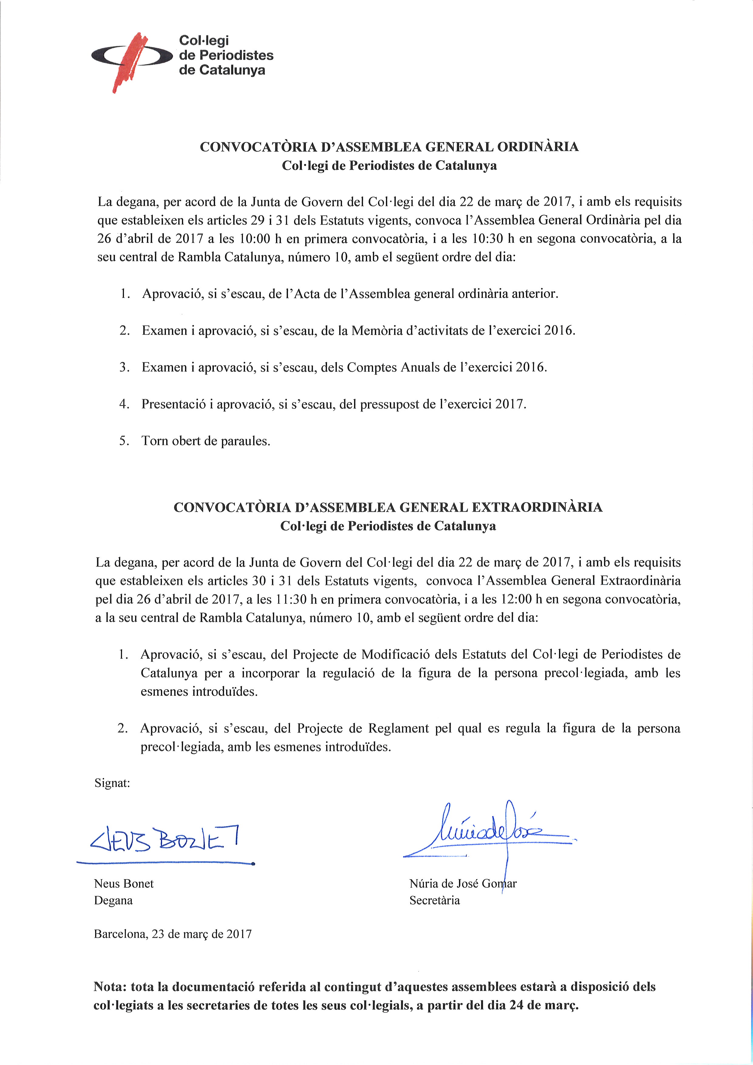 La Degana del Col·legi de Periodistes de Catalunya, per acord de la Junta de Govern, convoca l'Assemblea General Ordinària i l'Extraordinària per al dia 26 d'abril. Serviran per aprovar els resultats de l’exercici 2016, la memòria d'activitats, aprovar el pressupost del 2017 i la figura del precol·legiat, entre altres temes.