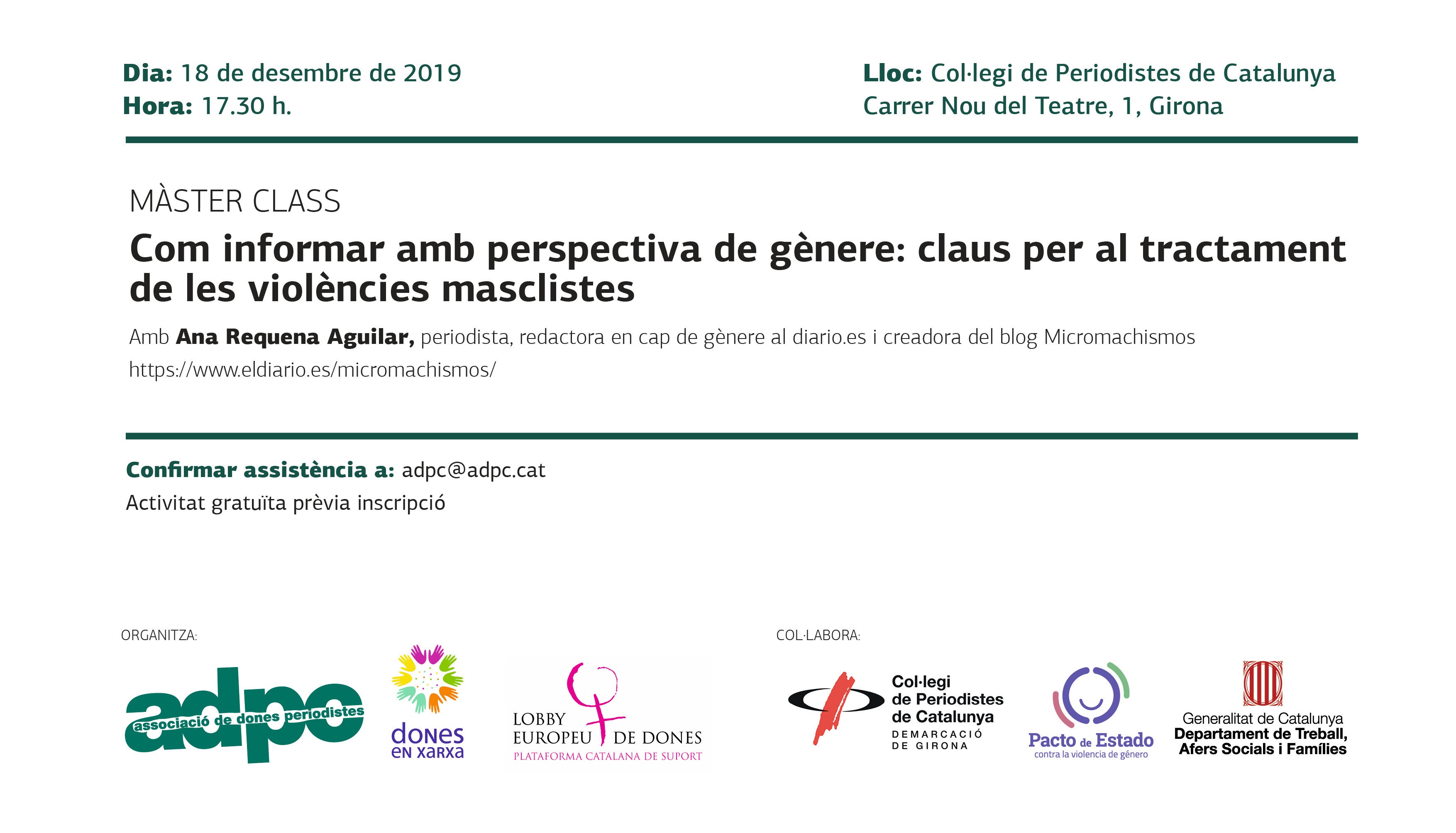La periodista Ana Requena Aguilar, redactora en cap de gènere a eldiario.es i creadora del bloc Micromachismos, va impartir a la seu de Girona del Col·legi de Periodistes la master class de petit format “Com informar amb perspectiva de gènere: claus per al tractament de les violències masclistes”. Hi van participar una dotzena de persones -tant periodistes com no-, que van valorar molt positivament la iniciativa i hi van participar activament exposant dubtes a la ponent.