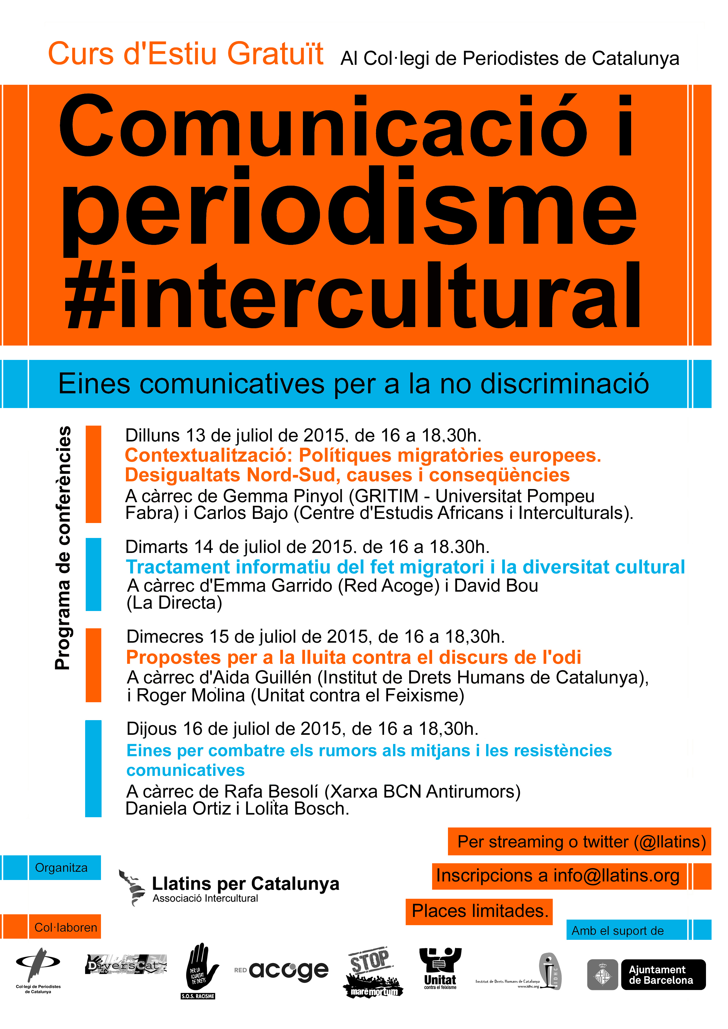L'Associació Intercultural Llatins/es per Catalunya realitzarà els propers 13,14, 15 i 16 de juliol el curs d'estiu "Comunicació i periodisme intercultural, Anàlisi i Eines comunicatives per a la no discriminació i la transformació social".