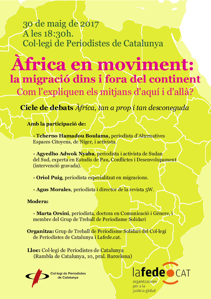 El Grup de Treball de Periodisme Solidari del Col·legi amb la col·laboració de la fede.cat ens porta un nou debat sobre la situació del continent africà en relació a com els mitjans expliquen els processos migratoris, quins temes marquen l'agenda i quines fonts s'utilitzen per tractar l'externalització de fronteres i les polítiques migratòries. La taula rodona "Àfrica en moviment: la migració dins i fora del continent" es realitzarà el dimarts 30 de maig a les 18:30h a la seu del Col·legi de Periodistes. El cicle de debats "Àfrica, tan a prop i tan desconeguda" té la finalitat d'apropar-nos a les persones africanes que conviuen amb nosaltres a Catalunya.