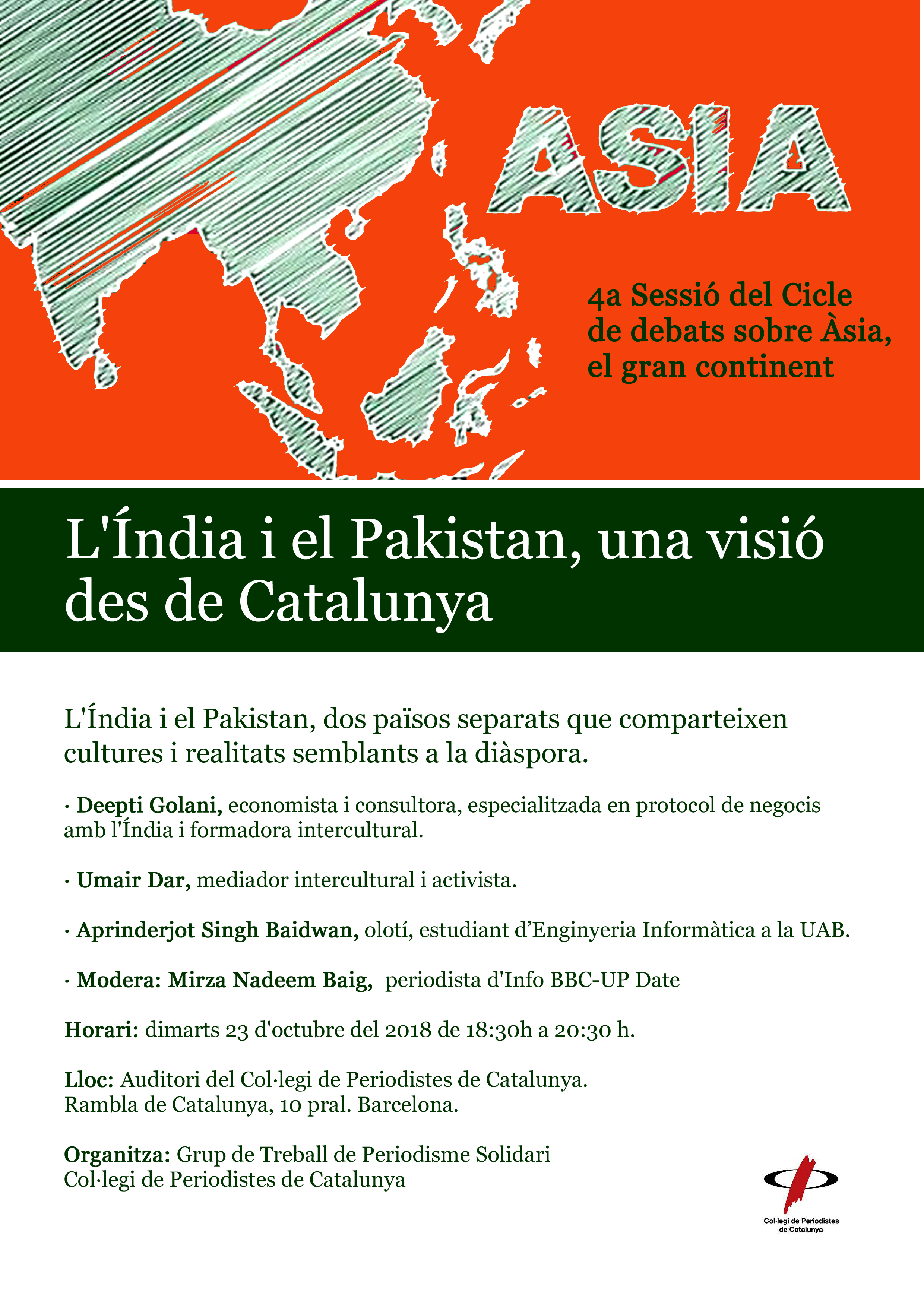 El Grup de Treball de Periodisme Solidari del Col·legi organitza la quarta sessió del Cicle de debat "Àsia, el gran continent" el pròxim dimarts 23 d'octubre a les 18:30h a la seu de Barcelona del Col·legi de Periodistes. El debat "L'Índia i el Pakistan, una visió des de Catalunya" permetrà conèixer diferents realitats sobre la diversitat de l'Índia i el Pakistan, en el centre del debat i en la convivència d’una Catalunya que cada cop es dibuixa més rica i diversa.