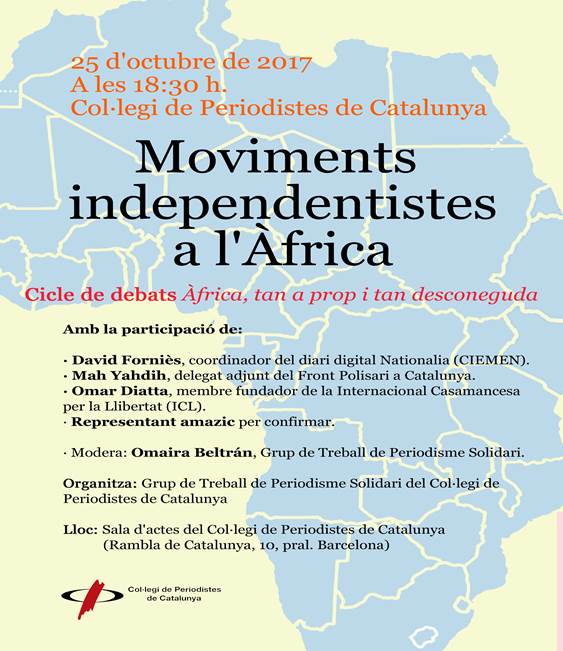 El Grup de Treball de Periodisme Solidari del Col·legi ens porta un nou debat sobre la situació del continent africà en relació als conflictes de caire secessionista que viu actualment. La taula rodona "Moviments independentistes a l'Àfrica" es realitzarà el dimecres 25 d'octubre a les 18:30h a la seu del Col·legi de Periodistes. El cicle de debats "Àfrica, tan a prop i tan desconeguda" té la finalitat d'apropar-nos a les persones africanes que conviuen amb nosaltres a Catalunya.