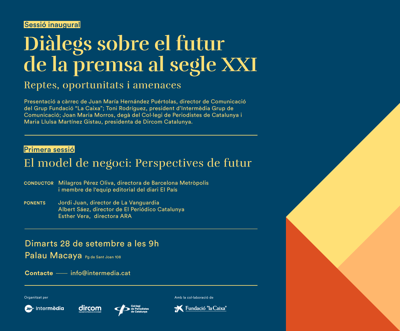 El passat 28 de setembre es va celebrar la sessió inaugural del cicle Diàlegs sobre el futur de la premsa al segle XXI, que organitza Intermèdia Comunicació amb el suport del Col·legi de Periodistes i Dircom Catalunya amb la col·laboració de la Fundació La Caixa.