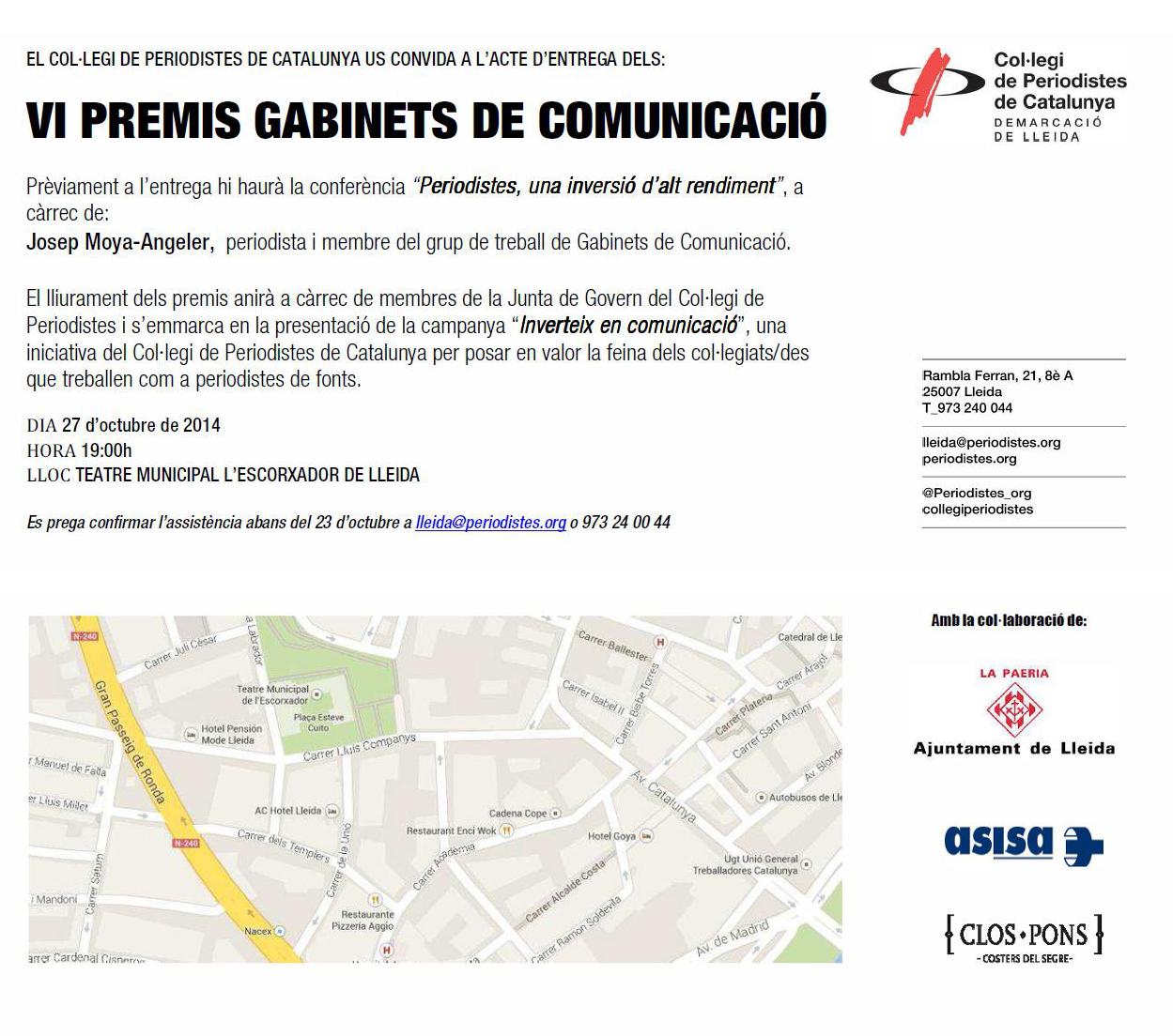 El lliurament serà el pròxim dilluns 27 d’octubre al Teatre Municipal de l’Escorxador de Lleida. L’acte comptarà també amb la conferència 'Periodistes, una inversió d’alt rendiment empresarial', a càrrec de Josep Moya-Angeler, periodista, director de l’agència de Comunicació 'Cinco', i membre del Grup de Treball de Gabinets del Col·legi de Periodistes.