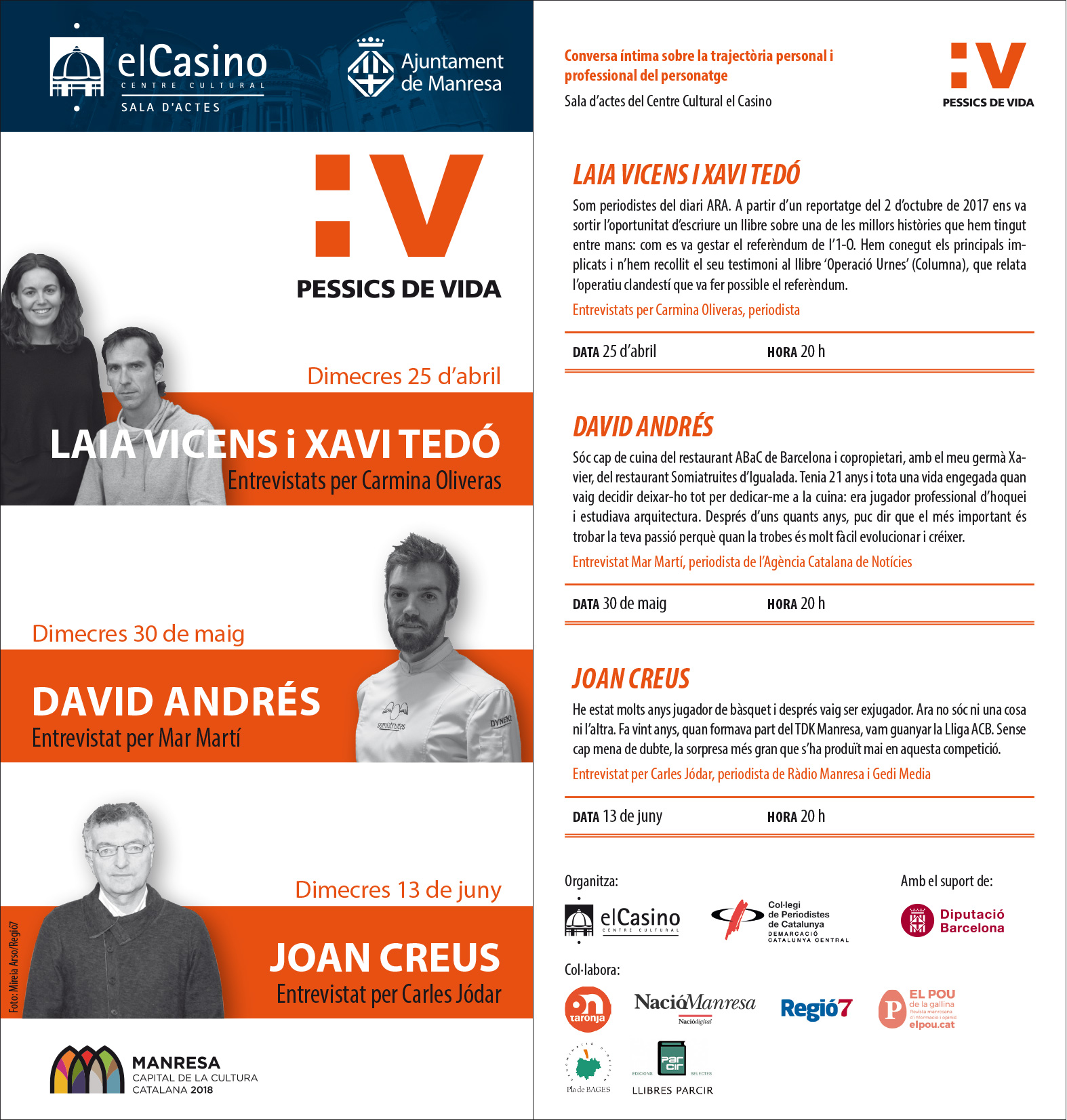 El cicle "Pessics de Vida", que organitza a Manresa la Demarcació Catalunya Central del Col·legi de Periodistes i el Centre Cultural el Casino, reprèn la seva programació conversant amb veus autoritzades del periodisme, la gastronomia i l'esport. Totes les entrevistes tindran lloc a la sala d'actes del Casino. a partir de les 8 del vespre.