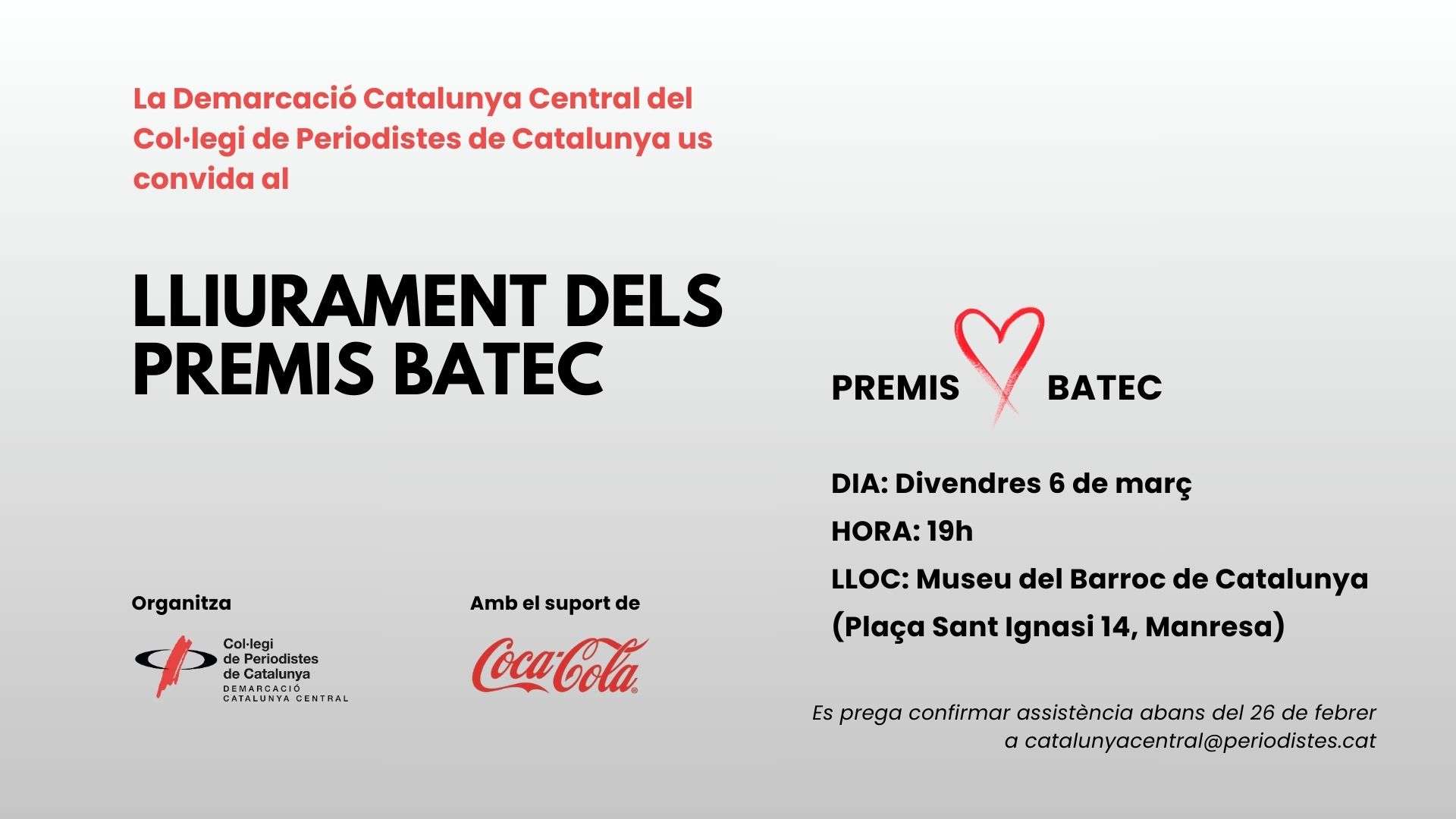 La Demarcació Catalunya Central del Col·legi de Periodistes de Catalunya celebrarà el divendres 6 de març, al Museu del Barroc de Catalunya a Manresa, els Premis Batec, els guardons anuals que reconeixen cinc categories: Periodista de l’Any, Trajectòria, Reportatge o Iniciativa periodística local, i els tradicionals Premis Plata i Plàtan.