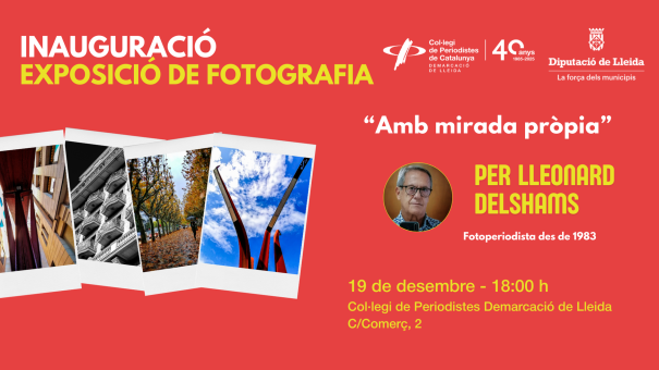 Per tancar les activitats del 2025, la Demarcació de Lleida del Col·legi de Periodistes es complau a convidar-vos a la inauguració de l'exposició de fotografia  "Amb mirada pròpia" creada pel fotoperiodista Lleonard Delshams, el pròxim divendres 19 de desembre a les 18:00 h a la seu del col·legi (C/Comerç núm. 2). Per confirmar l'assistència podeu enviar un correu a lleida@periodistes.org.