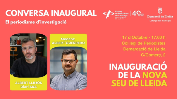 L'acte inaugural serà precedit pel Sr. Joan Talarn i Gilabert, president de la Diputació de Lleida i el Sr. Joan Maria Morros, degà del Col·legi de Periodistes de Catalunya, i la presidenta de la Demarcació de Lleida del Col·legi, la Sra. Laura Alcalde. La cita és aquest divendres 17 d'octubre a les 11:30 h. Podeu confirmar l'assistència escrivint al correu: lleida@periodistes.cat.