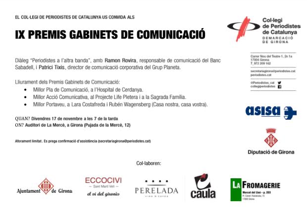 El Grup de Gabinets de Comunicació, dirigit per Jordi Navarro, té l’objectiu de reconèixer, dignificar i impulsar la tasca dels periodistes que han centrat la seva trajectòria cap als gabinets de premsa i comunicació. Tenen com a referència el manual Els gabinets de comunicació. Criteris de bones pràctiques professionals, que està basat en el Codi Deontològic dels professionals de la informació. Els premis de la IX edició es lliuraran el pròxim divendres 17 de novembre al Centre Cultural La Mercè de Girona.