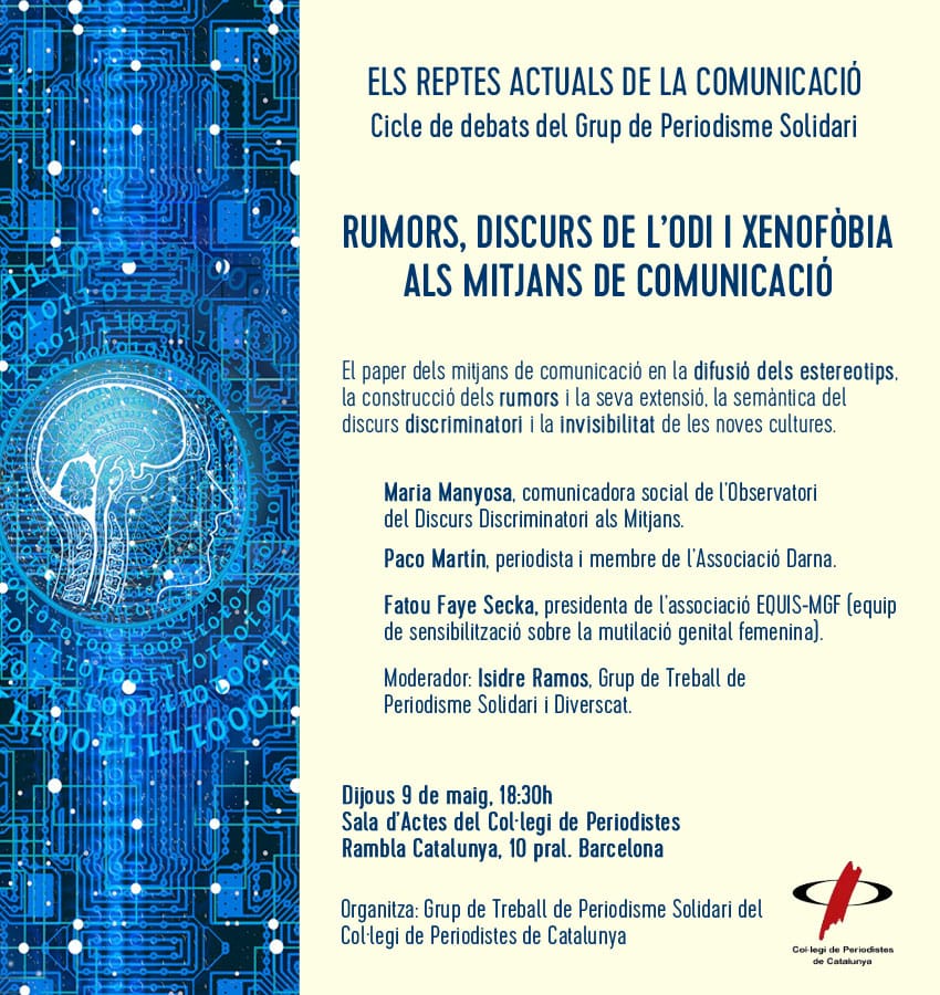 El Grup de Periodisme Solidari del Col·legi de Periodistes de Catalunya organitza el pròxim dijous 9 de maig, a les 18:30 hores, la Jornada “Rumors, discurs de l’odi i xenofòbia” on s’abordarà el paper dels mitjans de comunicació en la difusió dels estereotips, la construcció dels rumors i la seva extensió, la semàntica del discurs discriminatori i la invisibilitat de les noves cultures en els mitjans, entre altres temes.