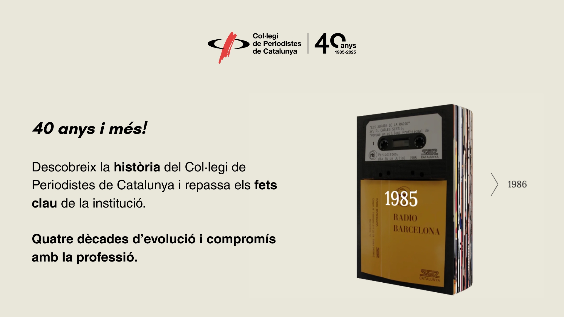 L’interactiu permet fer un recorregut cronològic, visual i documental per aquesta trajectòria, mostrant com ha evolucionat tant el Col·legi com la professió periodística. Hi destaquen les principals fites i reivindicacions impulsades per l’entitat: la demanda d’una llei sobre el secret professional i la clàusula de consciència, l’elaboració de guies jurídiques i de comunicació per donar suport als professionals, l’aprovació del primer Codi Deontològic, la defensa dels drets d’autor, la creació del Consell de la Informació de Catalunya, la taula sectorial dels mitjans o la campanya “Prou agressions”, entre d’altres.