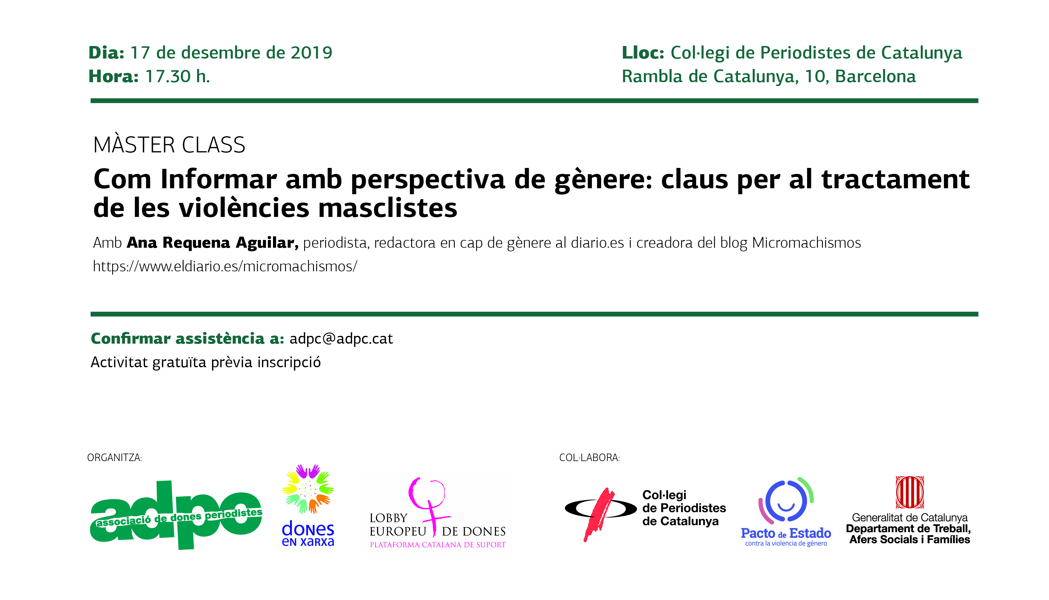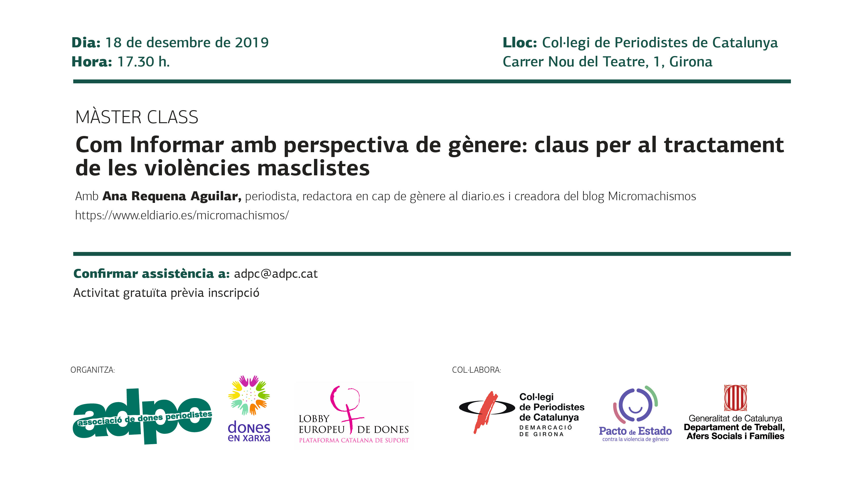 El Col·legi de Periodistes de Catalunya col·labora amb l'Associació de Dones Periodistes de Catalunya (ADPC), Dones en Xarxa i el Lobby Europeu de Dones en l'organització de dues master class amb Ana Requena, redactora en cap de Gènere d'eldiario.es i fundadora del bloc Micromachismos. Les activitats tindran lloc el dimarts 17 de desembre a les 17:30h a la seu de Barcelona del Col·legi de Periodistes i el dimecres 18 de desembre a la seu de Girona, a la mateixa hora. Les master class són gratuïtes amb inscripció prèvia a adpc@adpc.cat.