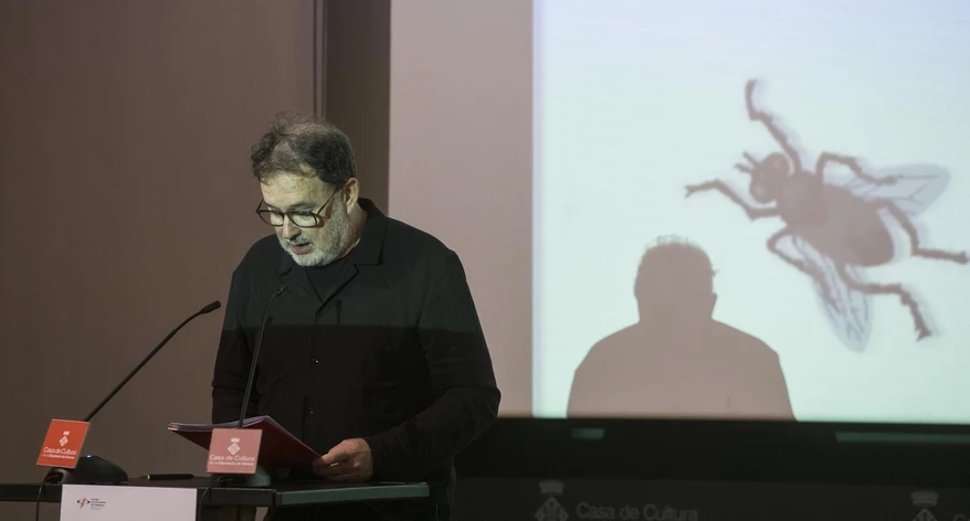 En l'acte també es va llegir un text de l'autora de les Mosques d'aquest any, Carme Sanglas, que per raons de salut no va poder acompanyar-nos. Sanglas considera tot un encert haver escollit la mosca com a ensenya del periodisme: “És àgil, ràpida, fugissera, apareix per sorpresa, esperona, no es cansa d’emprenyar, es fica per tot arreu, és múltiple. Si cal, ataca i desestabilitza, i molesta selectivament als forts”. Valora també també l’ampli registre d’aquests dípters: “Tant remenen entre la brutícia com són les bèsties sofisticades i elegants que es passegen per les fulles de les oliveres de Portlligat i que, com deia Dalí, semblen vestides de Balenciaga”.
