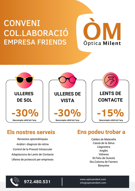 El Col·legi de Periodistes i Òptica Milent han arribat a un acord per oferir un 30% de descompte en ulleres de vista, ulleres de sol i un 15% en lents de contacte als col·legiats i els seus familiars. A més, tots els seus centres t'ofereixen un ampli servei en l’anàlisi i diagnosi visual i diagnosi de la retina. Cal acreditar la pertinença al Col·legi mitjançant el carnet col·legial vigent.