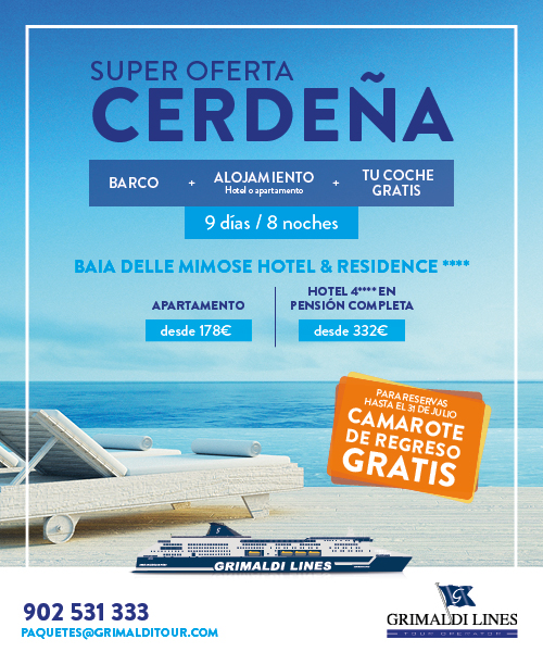 A més, Grimaldi Lines ha publicat una oferta per a viatjar a la Sardenya des de 178 euros per persona. El pack inclou: viatge amb vaixell des de Barcelona, allotjament de 8 dies i 7 nits a la Baia Mimose Hotel 4*, embarcament del cotxe gratis i taxes i assegurança de viatge. Si reserves abans del 31 de juliol, la cabina de tornada surt gratis.
