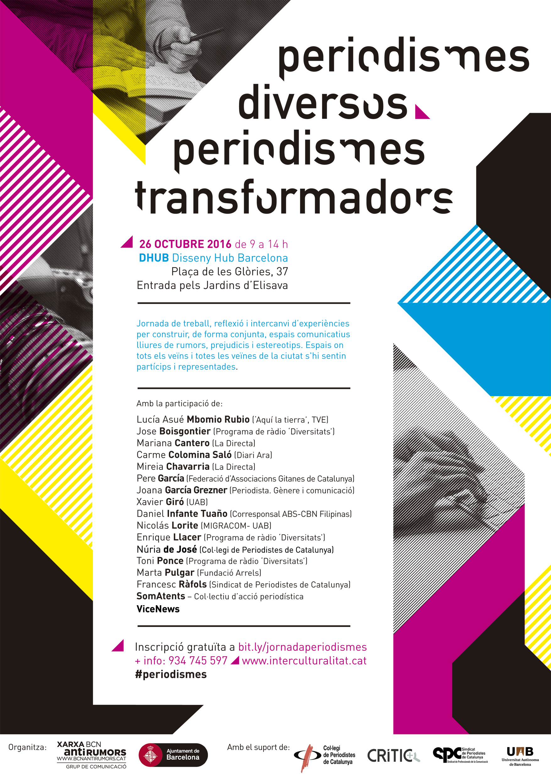 El pròxim 26 d’octubre de 2016, l’edifici Disseny Hub Barcelona acollirà, durant tot el matí, la jornada PERIODISMES DIVERSOS, PERIODISMES TRANSFORMADORS. La jornada té com a objectiu definir, impulsar i promocionar dinàmiques periodístiques i comunicatives que es connectin, de manera professional i responsable, amb la diversitat sociocultural de la ciutat.