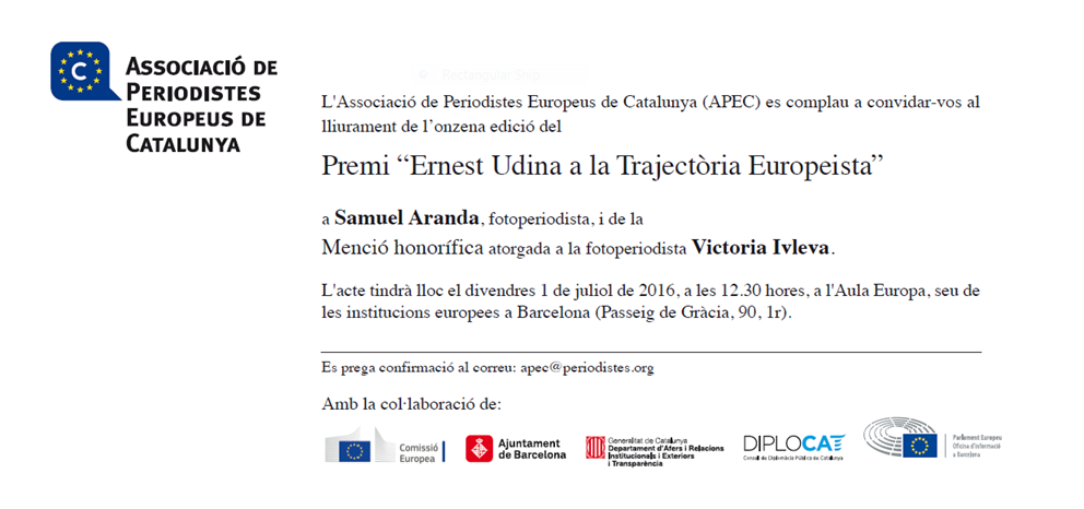 En aquesta onzena edició del premi Ernest Udina a la Trajectòria Europeista, l’Associació de Periodistes Europeus de Catalunya (APEC) vol reconèixer el valor dels professionals del fotoperiodisme, els quals aconsegueixen les imatges que expliquen la realitat, en moltes ocasions millor que les paraules.