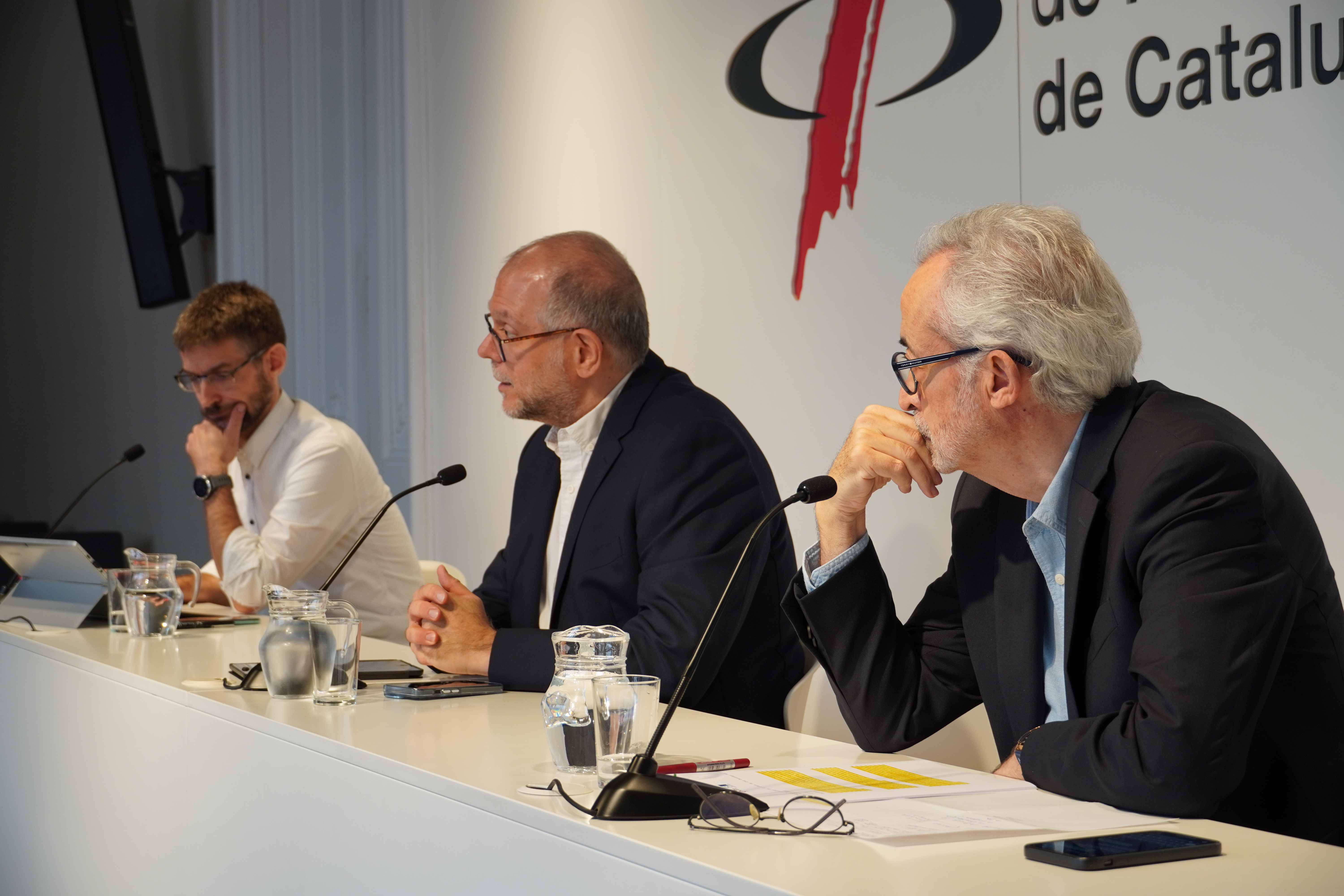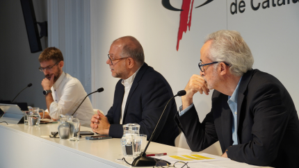 Joan Maria Morros, degà del Col·legi de Periodistes de Catalunya; Josep Carles Rius, president del Consell de la Informació de Catalunya i Carles Prats, director i coordinador de continguts del Congrés han presentat el VII Congrés de Periodistes de Catalunya en una roda de premsa celebrada aquest matí a la seu de Barcelona del Col·legi de Periodistes.