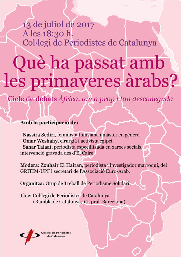 Han passat gairebé set anys des que el jove tunisià Mohamed Bouazizi s’immolés a Sidi Bouzid. Les revoltes ciutadanes que es van desfermar a molts carrers àrabs van provocar la caiguda de dictadors però, com ha acabat aquella esperança que semblava havia de transformar aquelles societats? Aquest és el plantejament del nou debat que organitza el Col·legi de Periodistes de Catalunya el pròxim 13 de juliol, a les 18:30, dins el cicle de debats "Àfrica, tan a prop i tan desconeguda".