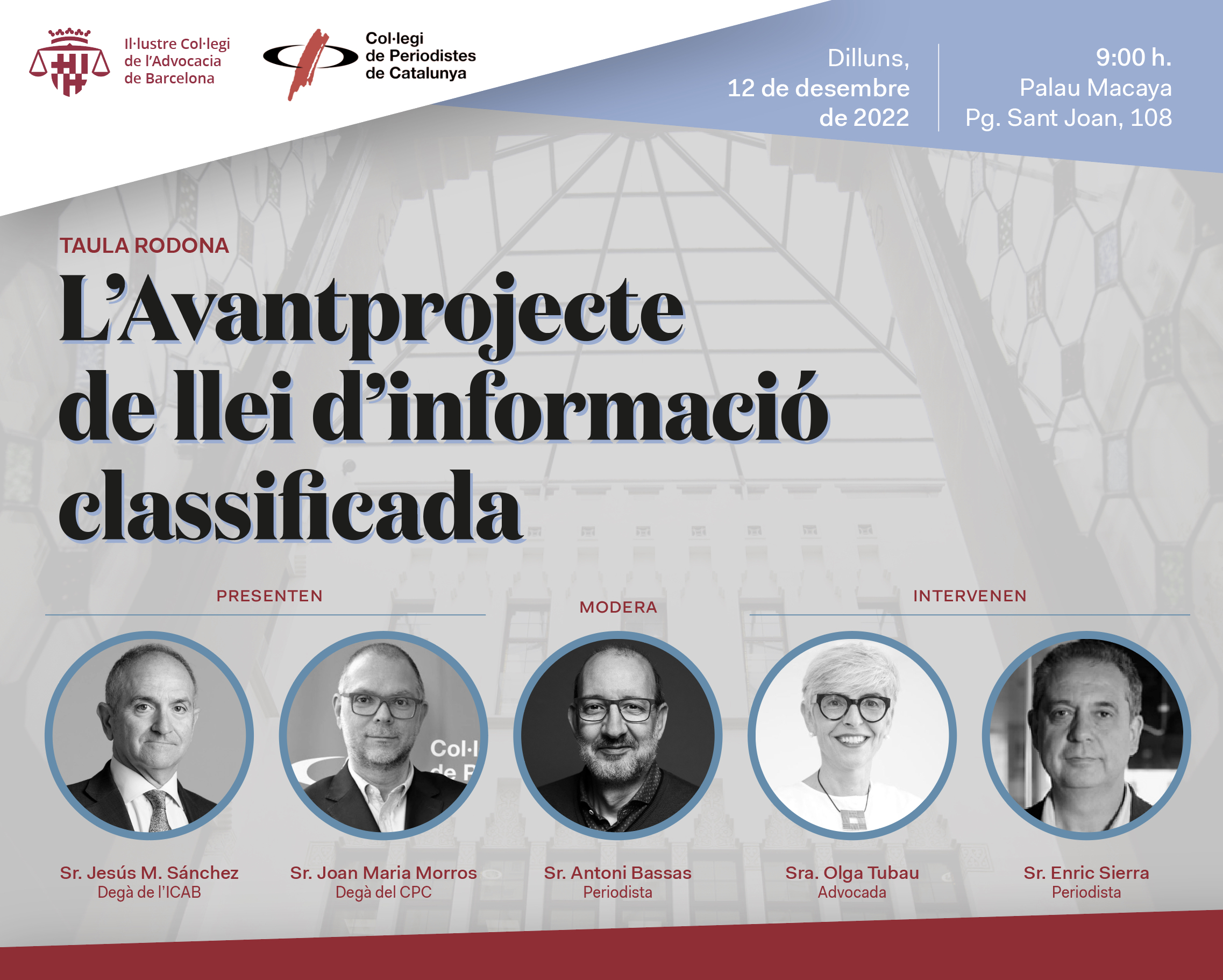 Però, de quina manera pot afectar la feina dels i les periodistes? Es vulnera el dret de la ciutadania a accedir a la informació pública? Les raons d'ordre públic poden ser suficients com per limitar-ne l'accés? És per això, per resoldre aquestes i d'altres qüestions el Col·legi de Periodistes de Catalunya i l'Il·lustre Col·legi de l'Advocacia de Barcelona (ICAB) han preparat una conversa per conèixer els detalls d'aquest esborrany de Llei. L'acte se celebrarà al Palau Macaya el pròxim dilluns 12 de desembre a les 9.00 h. Comptarem amb la participació d'Olga Tubau, advocada i membre de la Junta de Govern de l'ICAB, i Enric Sierra, director adjunt de La Vanguardia i membre de la Junta de Govern del Col·legi de Periodistes. El periodista del diari ARA i també col·legiat Antoni Bassas, serà l'encarregat de conduir la conversa.
