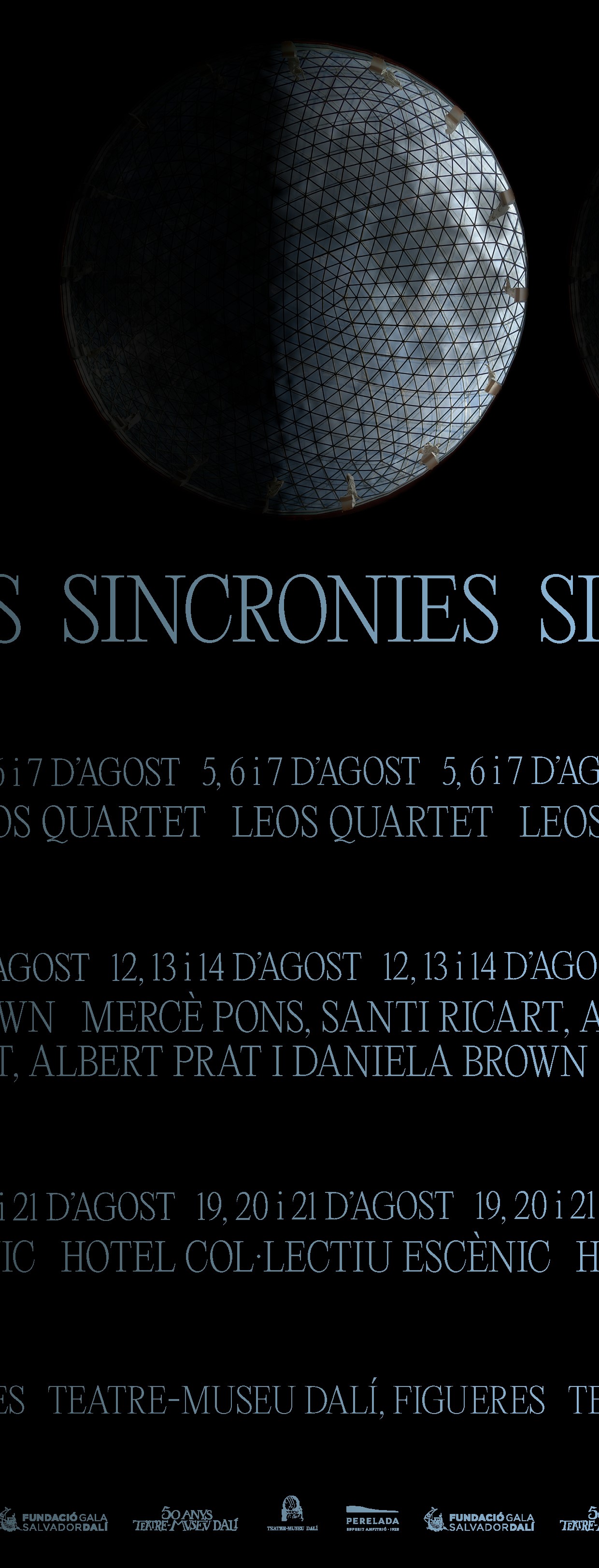 La Fundació Gala-Salvador Dalí estrena aquest estiu el programa Sincronies, una proposta que s'afegeix a les ja tradicionals visites nocturnes al Teatre-Museu Dalí que es fan durant l'agost. Al llarg de tres setmanes, les visites nocturnes dels dilluns, dimarts i dimecres comptaran amb espectacles sorpresa de dansa, text teatral o música: sopresa perquè, tot i que sap què s'hi trobarà, no se sap ni l'hora ni el lloc on es produiran.