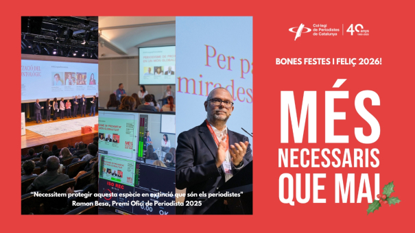 El 2025 ha estat un any especialment significatiu per al Col·legi de Periodistes de Catalunya, marcat per la celebració del 40è aniversari de la institució, que ha impregnat moltes de les activitats, projectes i iniciatives impulsades al llarg dels darrers dotze mesos. Ens acomiadem d'aquest intens 2025 amb un resum del més destacat. Us desitgem un nou any ple de bones notícies i de bon periodisme!