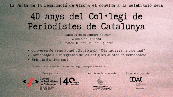 L’aforament és limitat, per això és imprescindible confirmar assistència abans del 12 de desembre enviant un correu a secretariagirona@periodistes.cat.