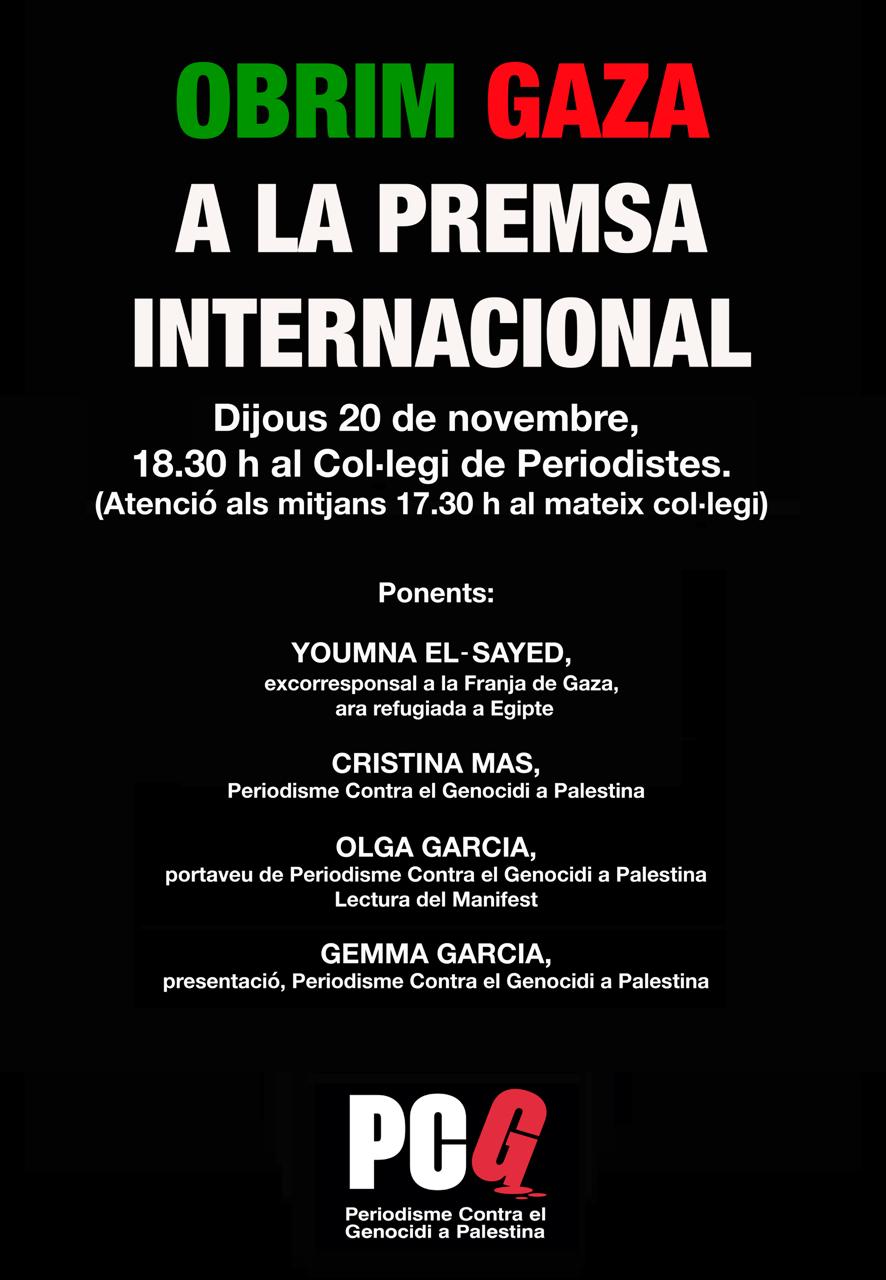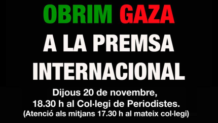 Aquest dijous 20 de novembre, a les 18.30 hores, tindrà lloc a la sala d’actes del Col·legi de Periodistes l’acte “Obrim Gaza a la Premsa Internacional”, amb l’objectiu de reclamar la fi del bloqueig que impedeix l’entrada de periodistes i mitjans de comunicació internacionals a la Franja de Gaza.