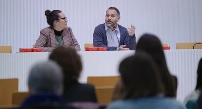 Fernando García Mongay presenta el Congrés de Periodisme d'Osca a la seu de Lleida del Col·legi de Periodistes de Catalunya.