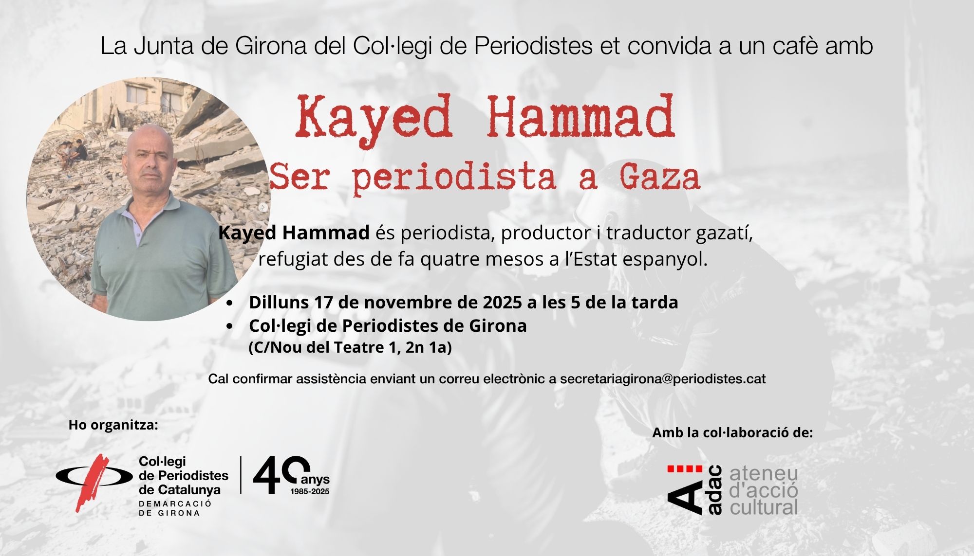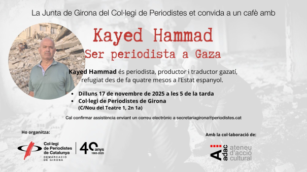 Amb la col·laboració de l'Adac, hem organitzat una trobada per a col·legiats amb Kayed Hammad, periodista, fixer i traductor, que va poder fugir de la franja fa tot just quatre mesos.
