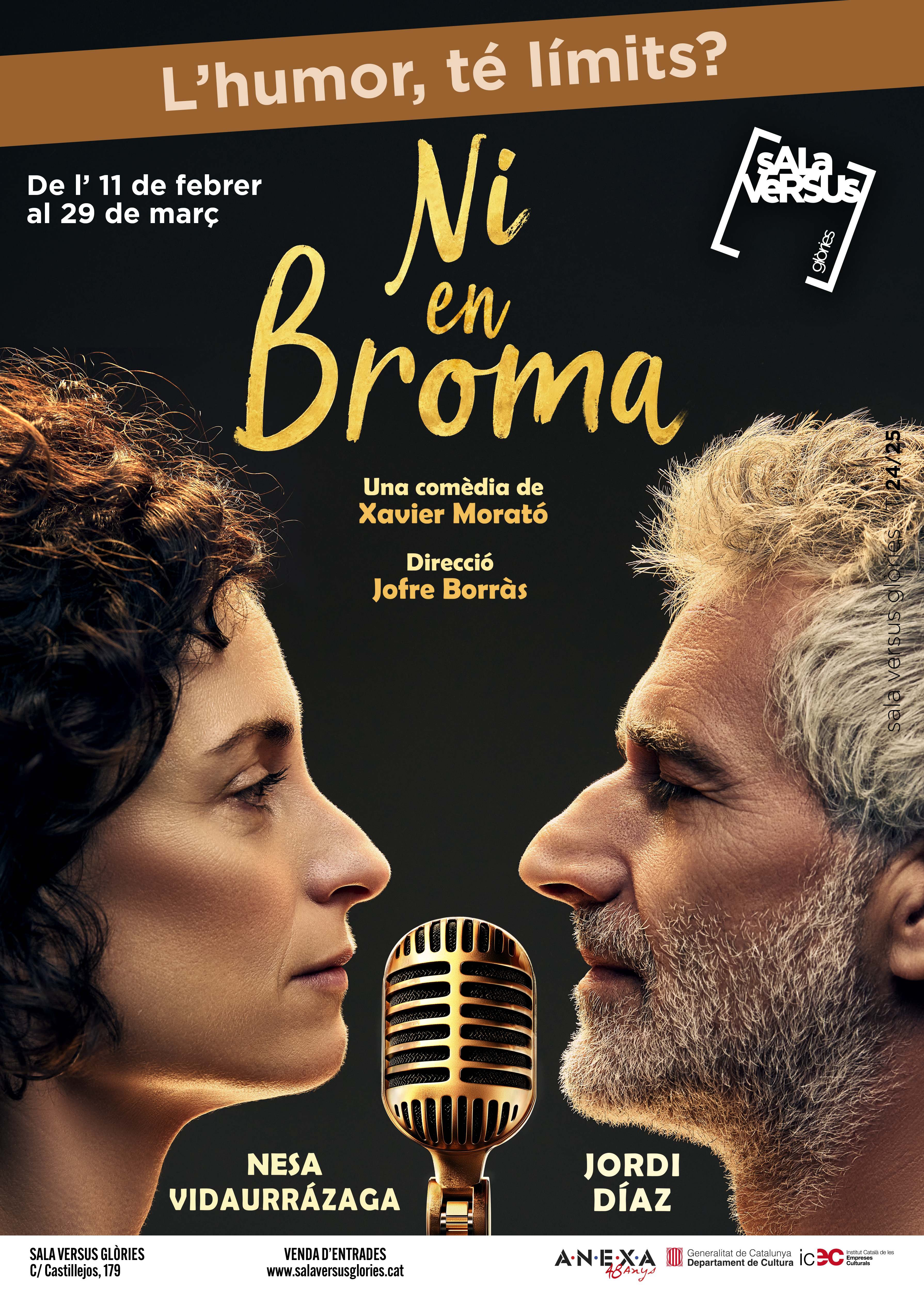 Després de l'èxit de la temporada passada, Sala Versus reestrena "Ni en broma", una comèdia de Xavi Morató sobre el límits de l'humor. L'obra parla de la cultura de la cancel·lació, l'autocensura i la hipocresia que envolta la política i la mateixa societat, i ho fa a partir de la contraposició de dos extrems en la manera de veure el món: una política que ha de seguir les normes de la correcció i l'autocensura, i un monologuista que es mou fora dels límits de l'acceptabilitat social. Tots dos necessiten captivar el seu públic, però amb mètodes i objectius oposats.
